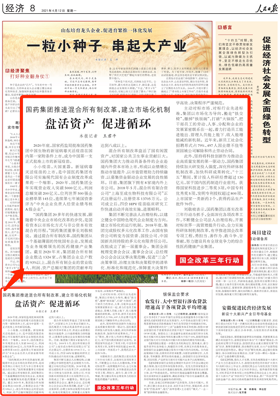 小小疫苗,大國(guó)重器。新冠病毒滅活疫苗的上市,是中國(guó)醫(yī)藥集團(tuán)有限公司實(shí)施現(xiàn)代國(guó)有企業(yè)制度改革成果的一個(gè)縮影。2020年,國(guó)藥集團(tuán)全年實(shí)現(xiàn)營(yíng)業(yè)收入突破5000億元,利潤(rùn)總額突破200億元,位列世界500強(qiáng)企業(yè)榜單第145位,連續(xù)第七年被國(guó)資委評(píng)為“中央企業(yè)負(fù)責(zé)人經(jīng)營(yíng)業(yè)績(jī)考核A級(jí)企業(yè)”。